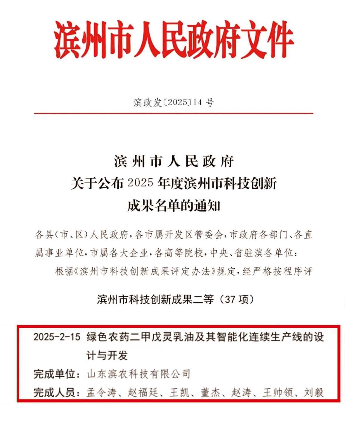 12月19日,濱州市人民政府公布了2025年度濱州市科技創新成果名單,我公司項目《綠色農藥二甲戊靈乳油及其智能化連續生產線的設計與開發》榮獲二等獎。該項目通過篩選出特殊高分子聚醚助劑為增效劑以及高效乳化劑,制得產品長期穩定可靠,降低了能耗與污染,并集成智能生產線實現自動化生產,成為綠 色農藥與智能制造融合的典范,對于推動我國實現綠色生態農業的目標發揮了積極推動作用。