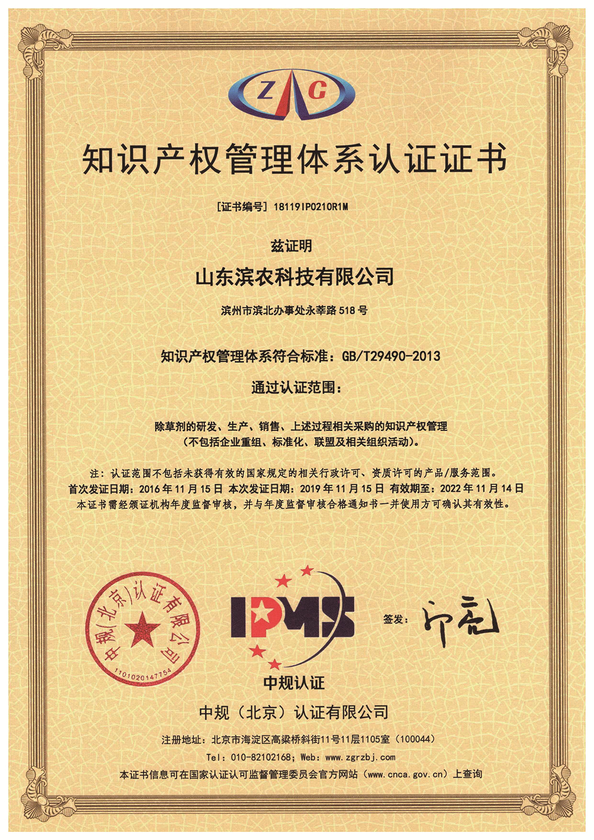 ■2019-12-30 我公司收到了中規(北京)認證有限公司頒發的《知識產權管理體系認證證書》