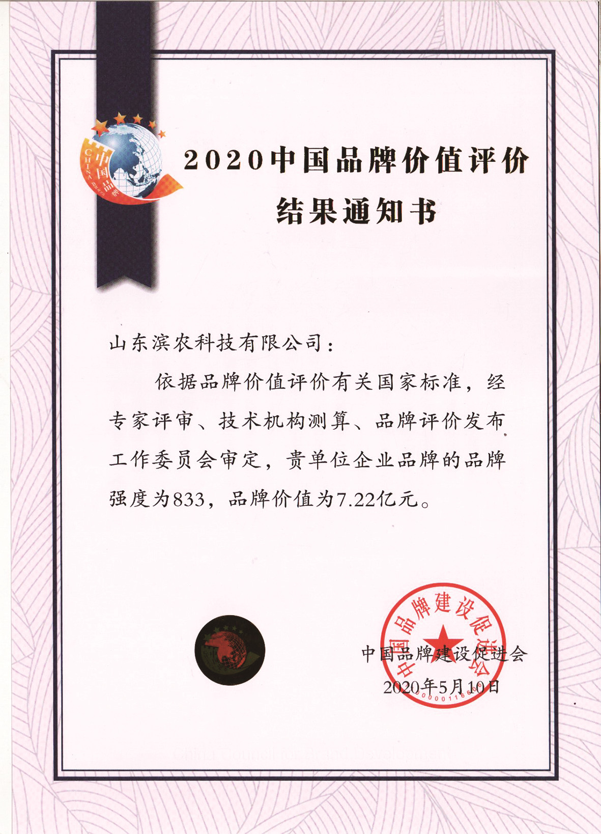 ■2020-05-10 我公司企業(yè)品牌的品牌強度為833,品牌價值為7.22億元