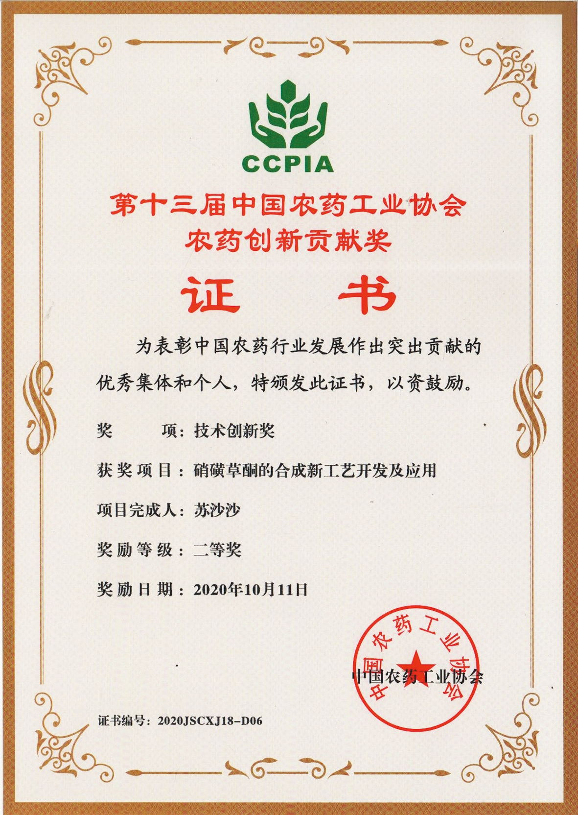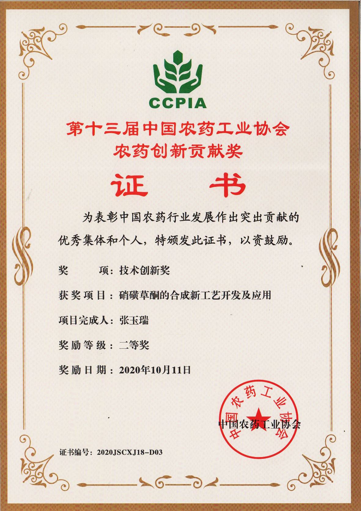 ■2020-11-15 2020-11-05 我公司“硝磺草酮的合成新工藝開發(fā)及應用”項目榮獲技術(shù)創(chuàng)新獎