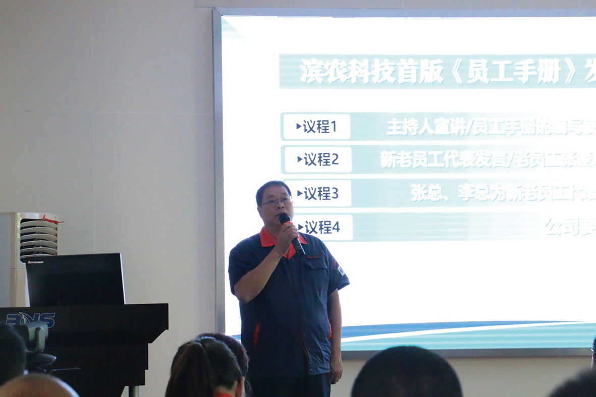 隨后,成品·裝卸工段工段長張奎峰及作物技術部王陽分別作為老員工、新員工代表進行了發言。張奎峰回顧了濱農二十多年來的發展與壯大,王陽則表達了新員工對未來發展的憧憬與信心;發言結束后,公司總經理張茂貴、董事長李華為兩人發放了手冊。