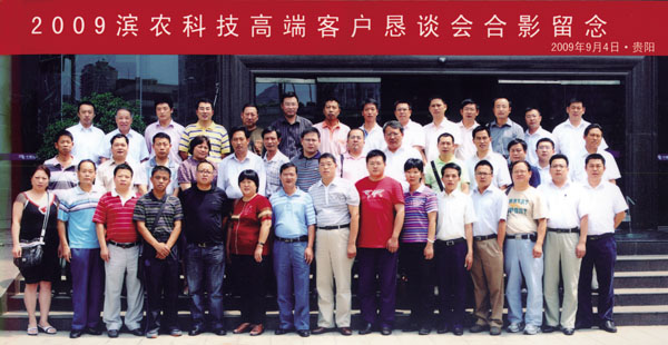 秋高氣爽,天氣宜人,2009年9月4日至6日,濱農科技董事長黃延昌率銷售公司代表一行人員,與來自全國各地的32位高端客戶相聚在山清水秀的貴陽市,就濱農目前存在的問題及未來發展瓶頸進行了廣泛而有益的交流,會議取得了圓滿成功。