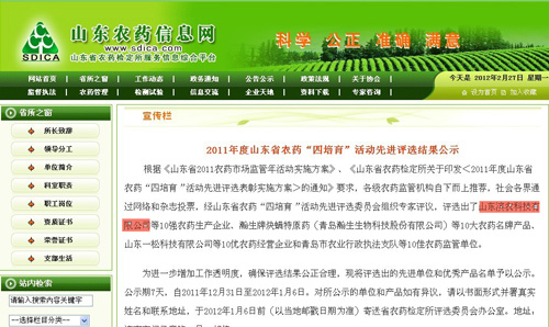 時(shí)間:2012-09-06 15:522012年1月6日,山東省農(nóng)藥檢定所主辦的2011年度山東省農(nóng)藥“四培育”活動(dòng)先進(jìn)單位和優(yōu)秀產(chǎn)品評(píng)選結(jié)果出爐:濱農(nóng)科技獲得十強(qiáng)農(nóng)藥生產(chǎn)企業(yè)第一名的榮譽(yù)稱號(hào)。這是我公司繼2010年度獲得第一名之后再次蟬聯(lián)這一稱號(hào)。