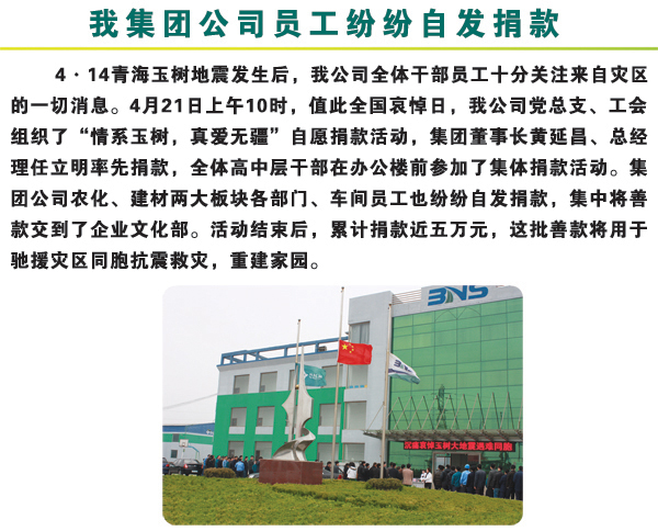 4·14青海玉樹地震發生后,我公司全體干部員工十分關注來自災區的一切消息。2010年4月21日上午10時,值此全國哀悼日,我公司黨總支、工會組織了“情系玉樹,真愛無疆”自愿捐款活動,集團董事長黃延昌、總經理任立明率先捐款,全體高中層干部在辦公樓前參加了集體捐款活動。集團公司農化、建材兩大板塊各部門、車間員工也紛紛自發捐款,集中將善款交到了企業文化部。活動結束后,累計捐款近五萬元,這批善款將用于馳援災區同胞抗震救災,重建家園。